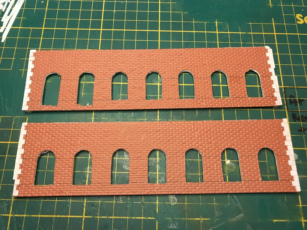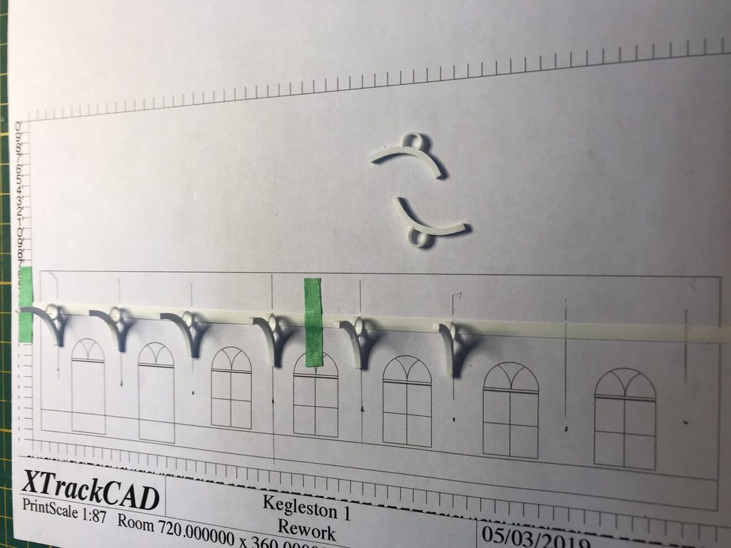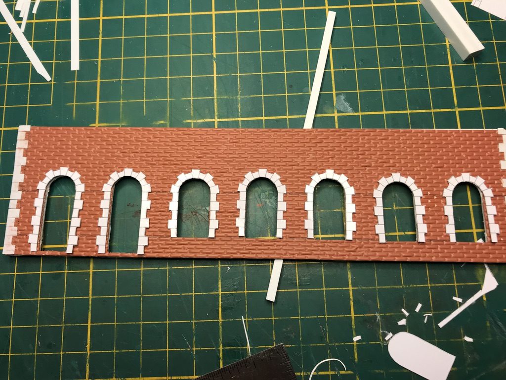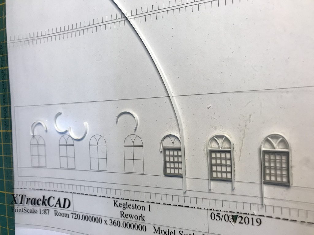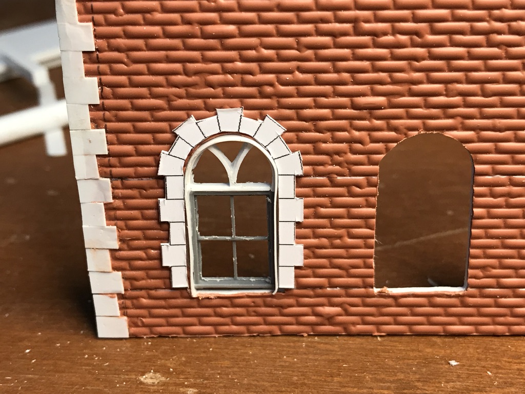 Scale 12 x 1 inch wide styrene strips were used to make the end block detail. Each block is cut to size and staggered on the edge to represent the placement of the cornerstones. This was too difficult for the arch windows, so patterns were designed in XTrackcad to scale and printed on Photo paper. Then cut out with a #11 hobby knife to make the detail.