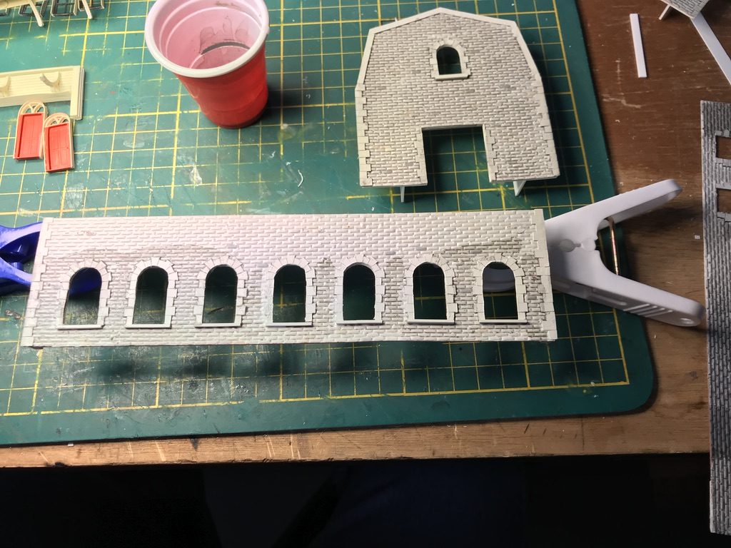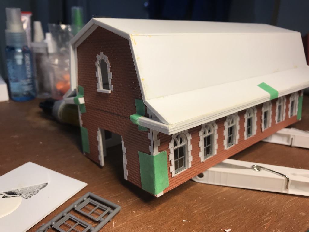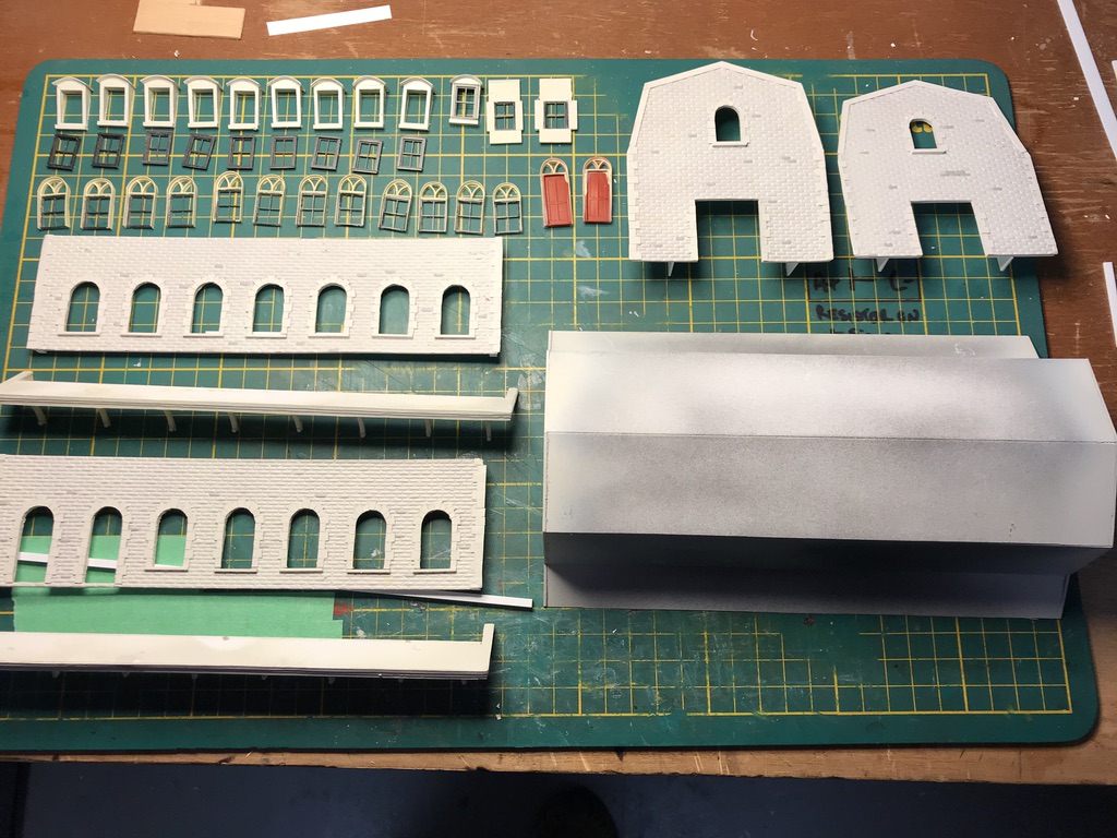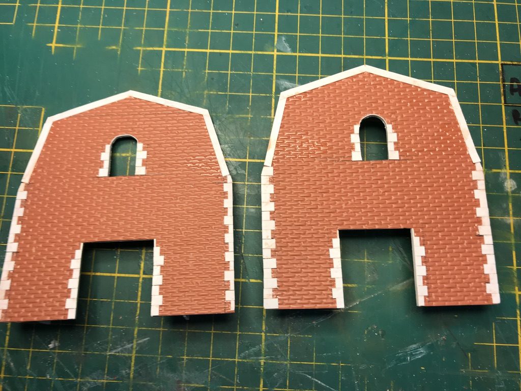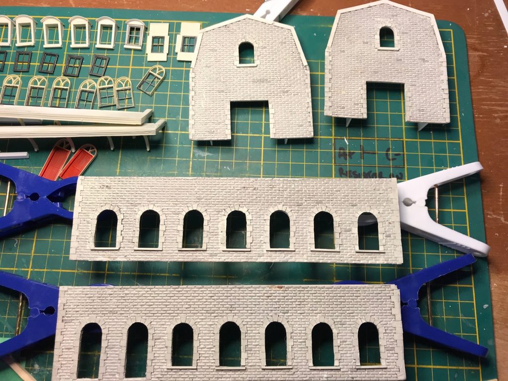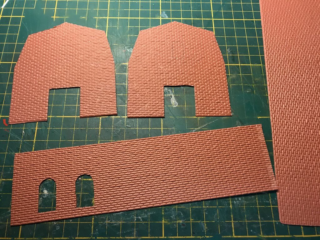 Scale 12 x 1 inch wide styrene strips were used to make the end block detail. Each block is cut to size and staggered on the edge to represent the placement of the cornerstones. This was too difficult for the arch windows, so patterns were designed in XTrackcad to scale and printed on Photo paper. Then cut out with a #11 hobby knife to make the detail.
