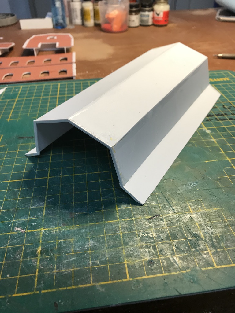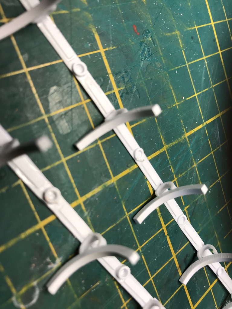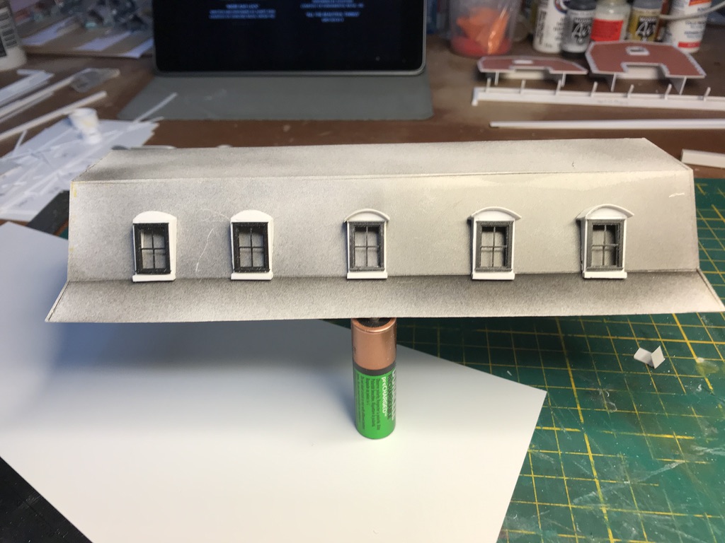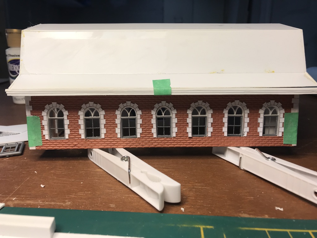 Styrene strips were used to build the details of the windows and roof support details. Styrene was curled by wrapping it around an appropriate size tube, held in place and dipped in boiling water for 5 minutes, then transfered to ice water to hold the curve. This was then cut to fit the window arches and roof supports.